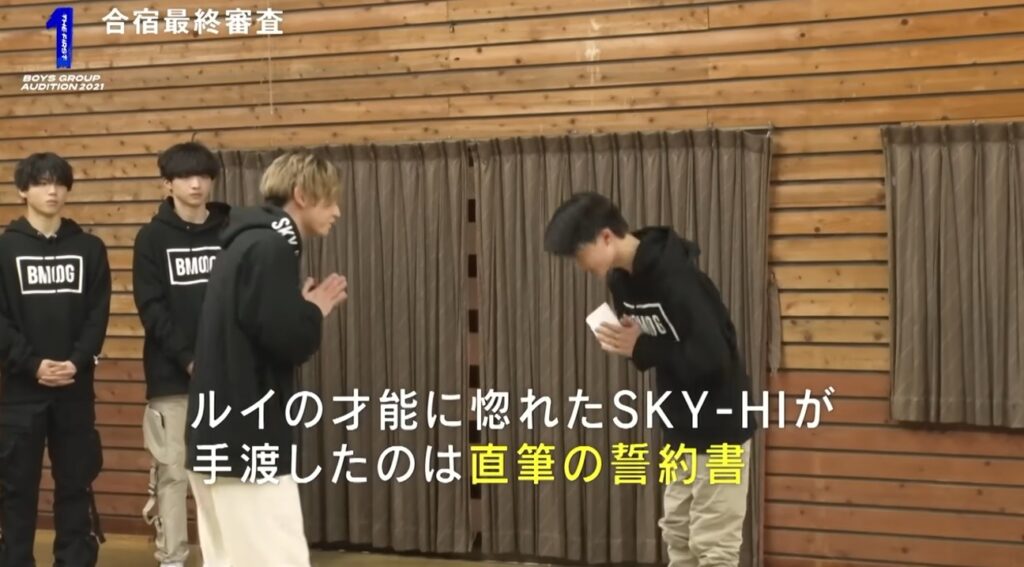 ルイさんは最終審査一歩手前の審査で脱落となってしまいましたが、ルイさんの歌唱の才能に惚れ込んだスカイハイさんが脱落を言い渡した直後に手書きの誓約書を渡し、ルイさんはBMSG初のトレーニー(練習生)となることが決まりました。